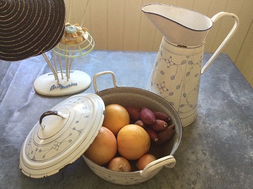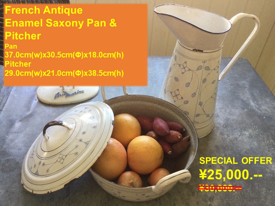 CAF 5 フランス アンティーク ホウロウ製 サクソニー柄 鍋 & 水差し 鍋 SOLD OUT 37.0cm(幅) 30.5cm(直径) 12.5cm(高−縁) 18.0cm(高−持ち手) 水差し 29.0cm(幅) 21.0cm(直径) 38.5cm(高)