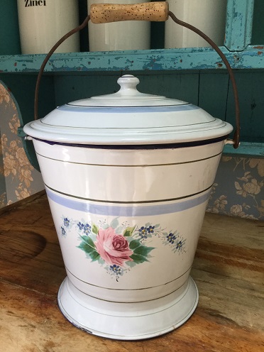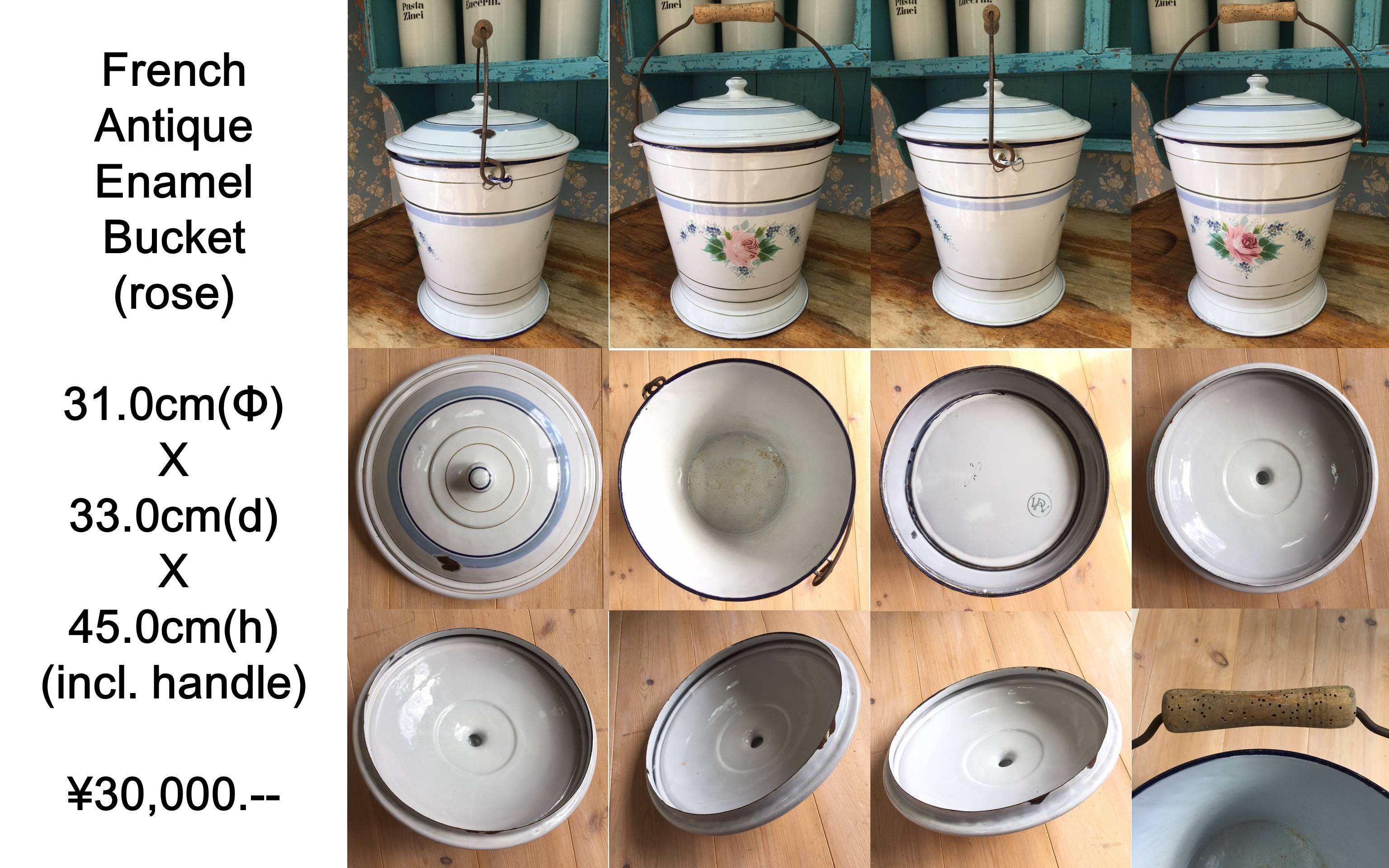 HOR 3 フランス アンティーク ホウロウ製バケツ(ばら) 31.0cm x 28.0cm(45.0cm) (直径 x 高(持手含))