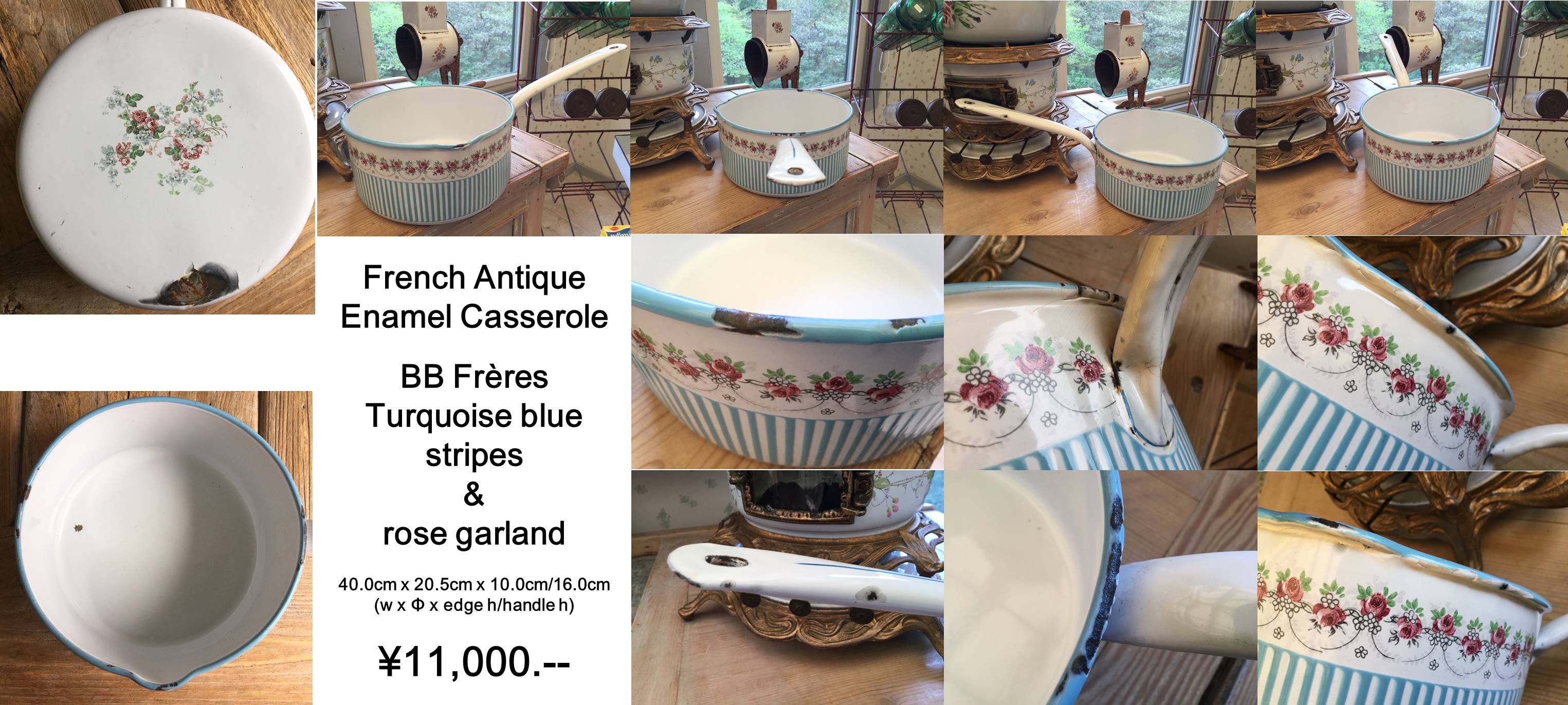 NAB 5 フランス アンティーク BB社 キャスロール 片手鍋 (底面 バラ柄付) ターコイズブルー縞模様/ ローズガーランド 40.0cm x 20.5cm x 10.0cm/16.0cm (幅 x 直径 x 縁高/持手高)
