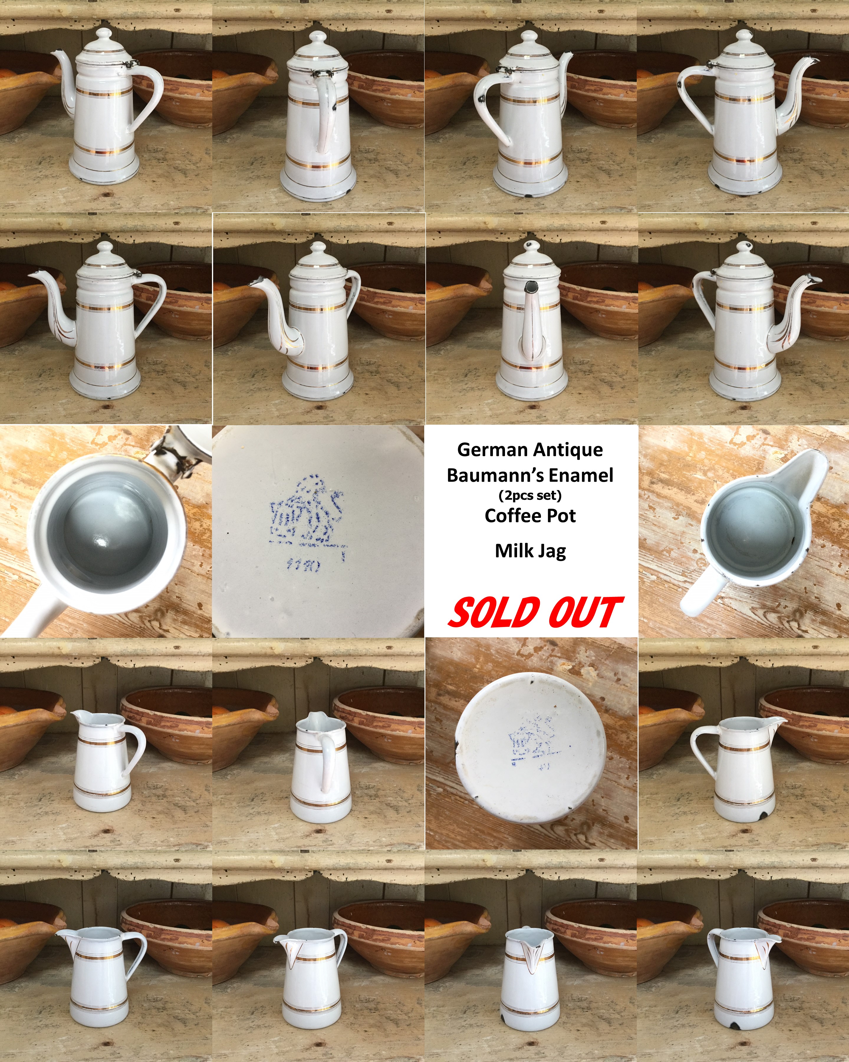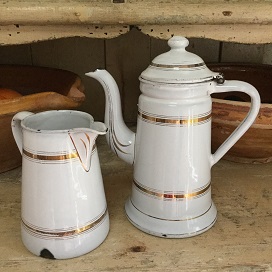 CPT 6 ドイツ アンティーク BAUMANN社・ホウロウ製 コーヒーポット&ミルクジャグ コーヒーポット 19.0cmx11.0cmx20.0cm (WxΦxH) ミルクジャグ 13.5cmx9.0cmx13.0cm (WxΦxH)
