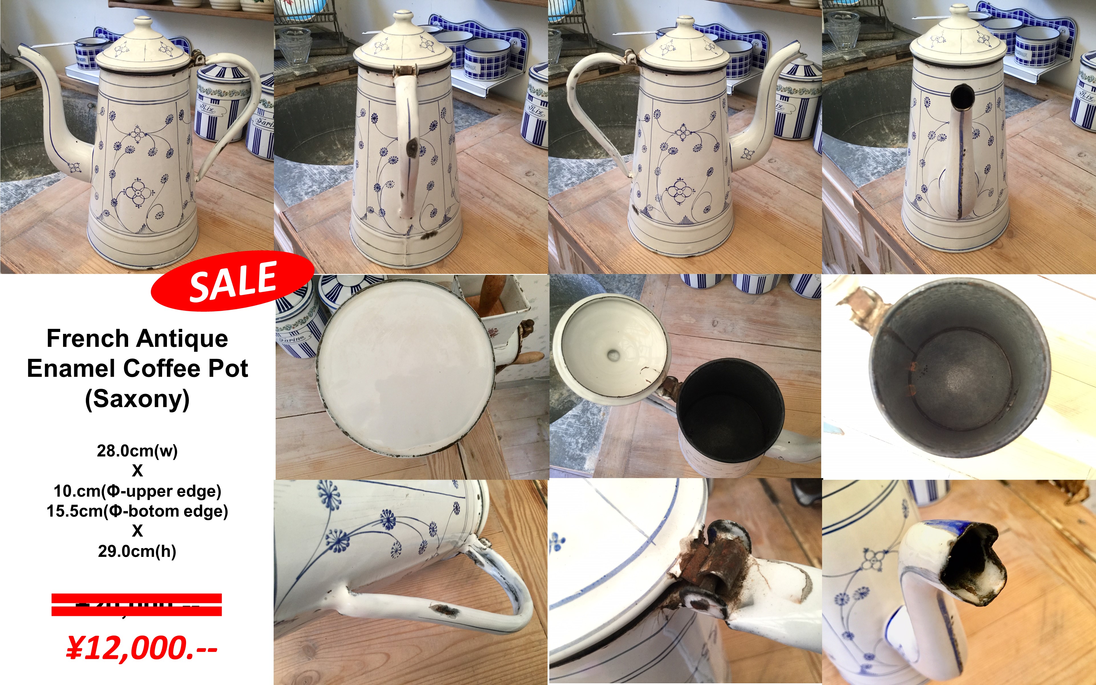 CPT 5 フランス アンティーク ホウロウ製 コーヒー ポット (サクソニー) 28.0cm(w) x 10.cm(Φ-上部縁)/15.5cm(Φ-底部縁) x 29.0cm(h)